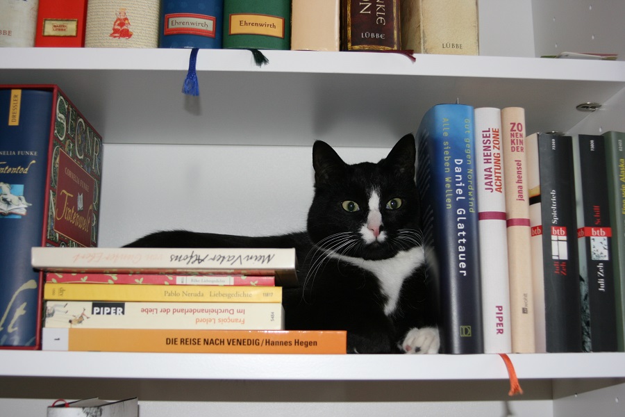 Re: 20. Dezember | Kategorie: FotografieMan kann Bücher auch mit einer Katze in Szene setzten.