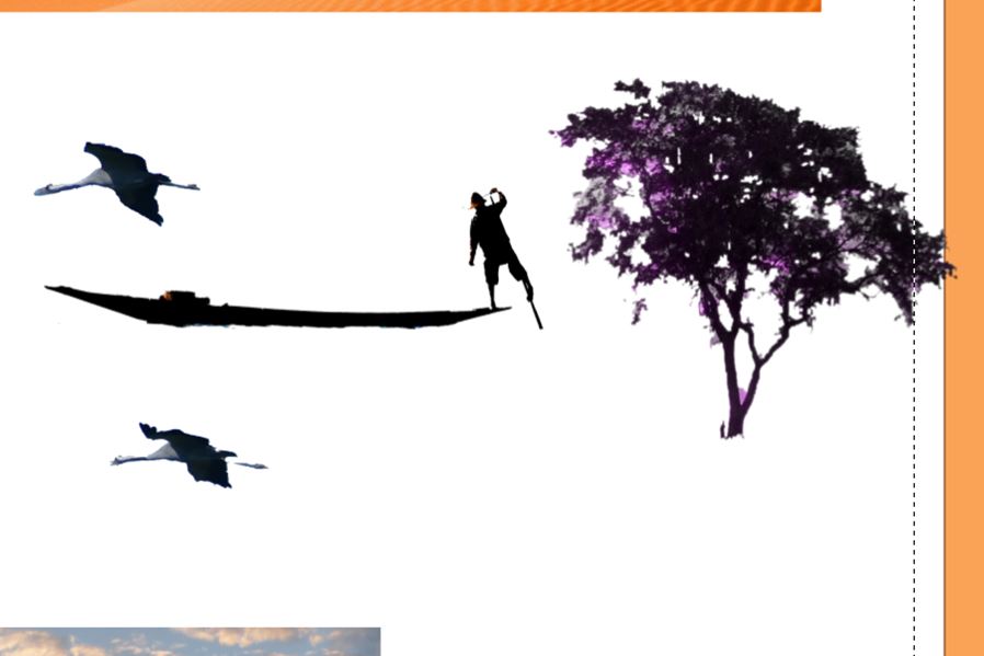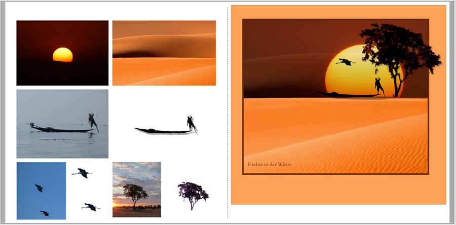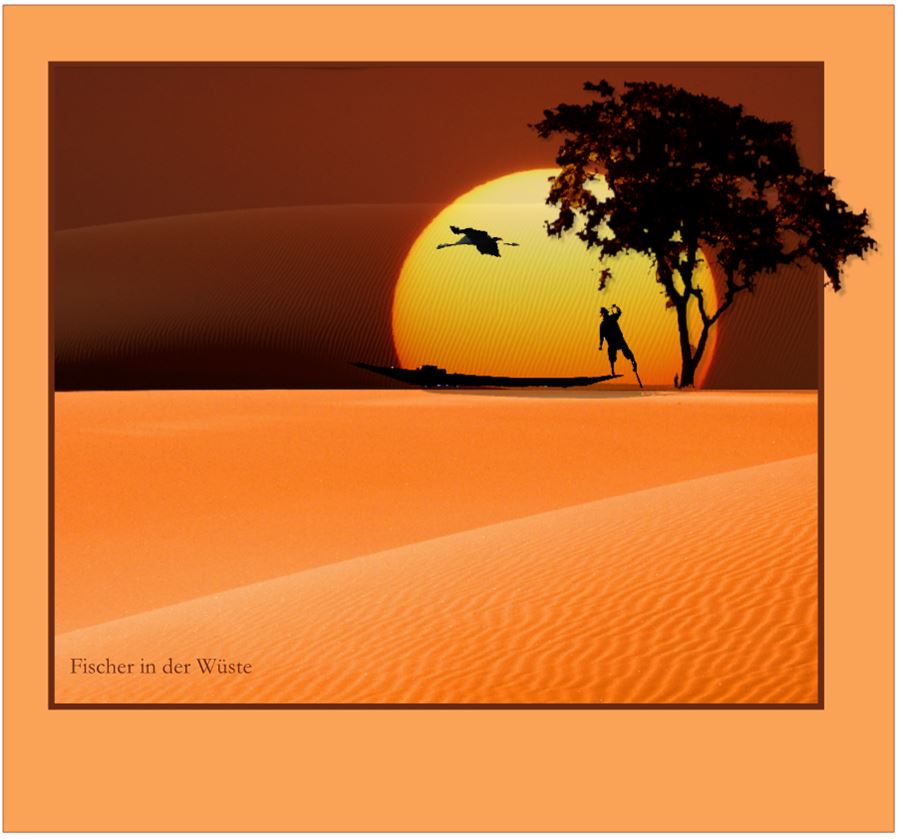 Aber ja doch. aber das hast Du doch nicht alles mit der CEWE-Fotoschau gebastelt ? Welche kreative Zusammenstellung macht Dich stutzig? Ich erkläre gerne, wie ich es gemacht habe. Wüstenbild aussuchen mit einem möglichst waagerechten Dünenkamm. Sonnenuntergangsbild darauflegen und leicht transparent setzen, damit man nicht merkt, dass die Horizontlinie nicht ganz exakt ist. Fischer, Baum und Kraniche ausschneiden mit der Fotoschau. Das Ergebnis ist nicht wirklich gut. Ich habe die Elemente hier in größer: Unter das Boot habe ich noch eine Clipart als transparenten Schatten gelegt. Rahmen, Bildhintergrund und Text sind sowieso kein Hexenwerk und nur Dreingabe. Lieber Gruß, pitty