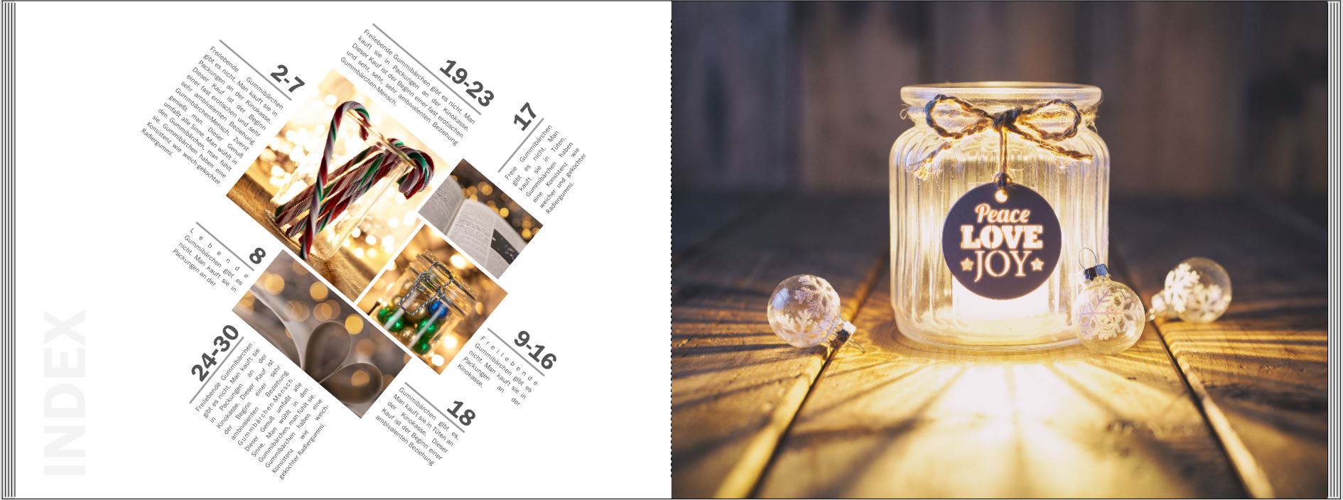 Liebe Forenteilnehmer, die heutige Herausforderung ist Ihnen vermutlich vertrauter als mir. Um so mehr freue ich mich auf Ihre kreativen Ideen zum Thema. Vielleicht mögen Sie auch hier Ihre Komfortzone verlassen und einen ganz neuen Stil ausprobieren. Aufgabe: Inhaltsverzeichnis Das können Sie gewinnen: Audible Hörbuch-Abonnement Sie erhalten 12 Hörbücher (1 Hörbuch pro Monat) sowie unbegrenzt Audible Original Podcasts. Die Hörbücher gehören Ihnen auch nachdem Ihr Geschenkabo beendet ist. Bei Nichtgefallen können Sie Titel einfach zurückgeben. Dieses Abonnement endet automatisch nach Ablauf der Laufzeit. Ihre Titel bleiben alle in Ihrer Bibliothek und ungenutzte Guthaben stehen Ihnen noch 3 Jahre zur Verfügung. CEWE Gutschein im Wert von 50 Euro Fotogeschenke haben immer Saison! Gestalten Sie tolle Geschenke für jeden Anlass und jede Gelegenheit. Wählen Sie Ihr Lieblingsprodukt in unserem Portfolio. Nach Ablauf der Spieldauer können Sie Ihren persönlichen Gewinner wählen. Dazu stelle ich eine kleine Umfrage bereit, die um Mitternacht des Bereitstellungstages geschlossen wird. Die Einreichung mit den höchsten Wertungen bzw. der Teilnehmer mit der höchst gewerteten Einreichung erhält den Gewinn. Spieldauer: Die Adventsaufgabe startet mit der Veröffentlichung und endet um Mitternacht des im Betreff genannten Spieltages! Hinweis: Für die Teilnahme an diesem X-Mas Special ist ein Posting mit Ihrer kreativen Idee zum Thema erforderlich. CEWE vergibt pro Adventsaufgabe einen Hauptpreis. Nach Abschluss der täglichen Adventsaufgabe wird der Gewinner im Forenbeitrag genannt und schriftlich benachrichtigt. Wir wünschen Ihnen viel Glück bei unserer Adventsaufgabe und wünschen Ihnen eine besinnliche Weihnachtszeit. Lust auf weitere Gewinnchancen? Dann schauen Sie täglich in diesen Forenbereich. Es warten tolle Herausforderungen und interessante Gewinne auf Sie! Sylke Re: 16. Dezember | Kategorie: KreativesMein Inhaltsverzeichnis meines derzeitigen Fotobuchs C:mrgreen: