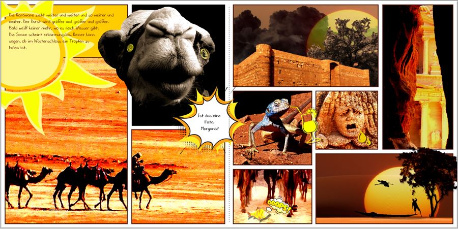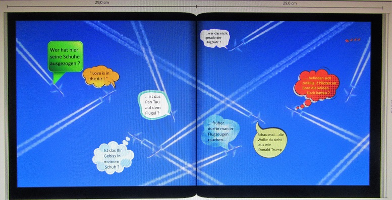 Dafür habe ich vorerst die Fotos in der Fotoschau mit dem Gammafilter und dem Stilisierungsfilter "Ölgemälde" bearbeitet. Leider wird die Veränderung trotz Bestätigung nicht ins Fotobuch übernommen (jedenfalls bei mir nicht). Ich musste mir daher behelfen und habe von der Bearbeitung in der Fotoschau ein screenshot gemacht und diesen dann eingefügt. Anschließend wurden die Fotos mit Masken belegt, Sprechblasen und Texte eingefügt. Die Doppelseiten haben noch verschiedene Hintergründe und die Fotos sind leicht transparent, damit alle Elemente farblich harmonieren. Lange Erklärung - hier ist es: Lieber Gruß, pitty