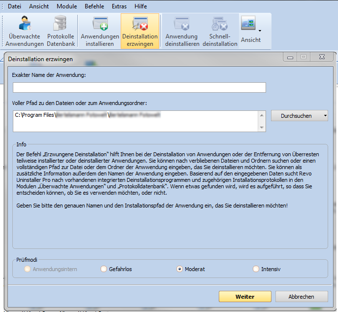 ich habe bewusst eine Installation zerstört und so eine Deinstallation auf gängigem Wege unmöglich gemacht. In der Systemsteuerung und im Revo Client (Oldnats Tipp) wurde die Anwendung nicht mehr gelistet. Eine Deinstallation ist mir mit Oldnats Tipp dennoch gelungen. Wenn Sie auf "Deinstallation erzwingen" klicken, können Sie das Programmverzeichnis auswählen. Im folgenden werden Ihnen dann alle zugehörigen Daten auf Ihrer Festplatte und Einträge in der Registry angezeigt. Wenn Sie die Löschung nach Prüfung bestätigen, wird alles restlos von Ihrer Platte entfernt. Sylke Re: Deinstallieren älterer SoftwareDas war ich nicht mit Revo... das war pefoto... ich mache das händisch... denn ich habe das schon gemacht lang bevor es revo gab... ich wurstle in der Registry seit Windows NT 3.5 schon herum... habe damals Trainings mit Dave Cutler gehabt... Dino eben...