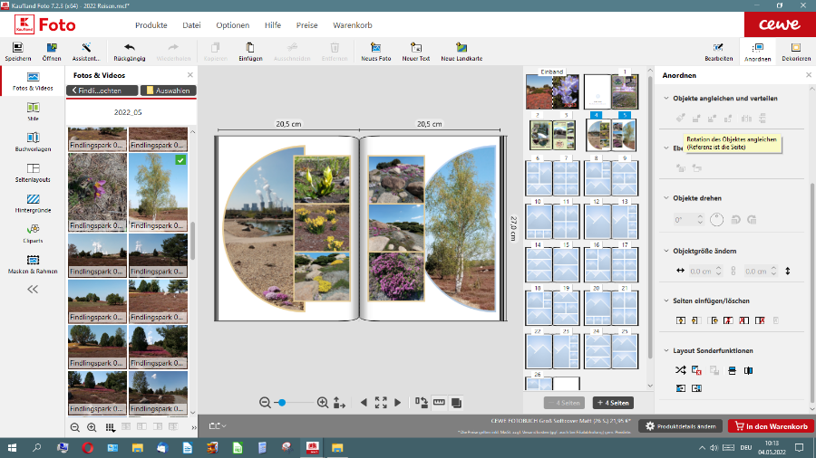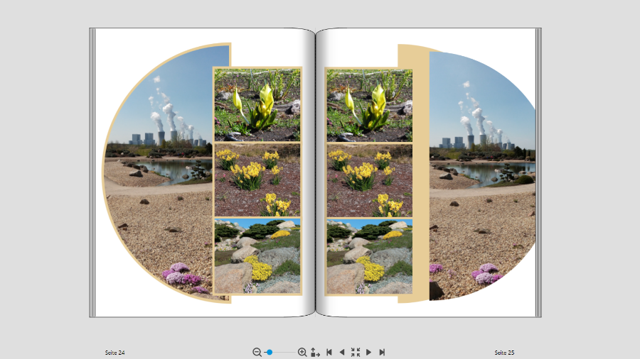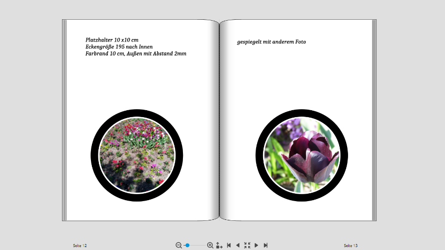 bei der Funktion Layout spiegeln werden nur die Positionen der Elemente auf die andere Seite gespiegelt, nicht die Elemente selbst. An Deinem neuen Beispiel sieht man die gespiegelte Position sehr schön. Auf der linken Seite ist der Abstand der Kreisgestaltung zum linken Seitenrand etwas geringer als zum Falz. Gespiegelt auf die rechte Seite ist es jetzt entsprechend genau umgekehrt. Masken, Cliparts etc. sind in ihrer Darstellung anhand der Objektnummer immer fixiert. Maske/Clipart spiegeln und Layout spiegeln sind zwei unabhängige Funktionen der Software, die einzeln genutzt werden können/müssen. Somit ist beim Spiegeln des Layouts immer eine Nacharbeit erforderlich, wenn auch die Elemente selbst gespiegelt werden sollen. Auf Seite 13/14 meiner Anleitung zu den Versionen ab 7.x ist dies auch teilweise bildlich dargestellt. Liebe Grüße