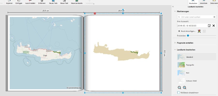 --> Neue Landkarte einfügen --> Route Hinzufügen (GPX, KMZ oder KML) --> Ausschnitt festlegen per Landkartenausschnitt anpassen, zoomen, schieben --> Eigene Karte einfügen und ausrichten, eine Ebene hinter die Landkarte schieben --> Route freistellen: Regler ganz nach links schieben. So bleibt nur noch die Route sichtbar, die Karte selbst wird komplett transparent. --> Maske mit Verlauf auf die Landkarte legen, damit "Openstreetmap" nicht am unteren Rand solo sichtbar stehenbleibt --> Fertig Die Darstellung der Route (Strichfarbe, -dicke etc.) kannst Du individuell nach Deinen Wünschen anpassen. Hier mal ein schnelles Beispiel mit einem Kreta-Clipart statt eigener Landkarte: Reicht Dir das mit den schnellen Stichpunkten oder brauchst Du noch Hilfe für die Landkartenfunktionen? Dann füge ich gern ein paar Screenshots hinzu. Liebe Grüße