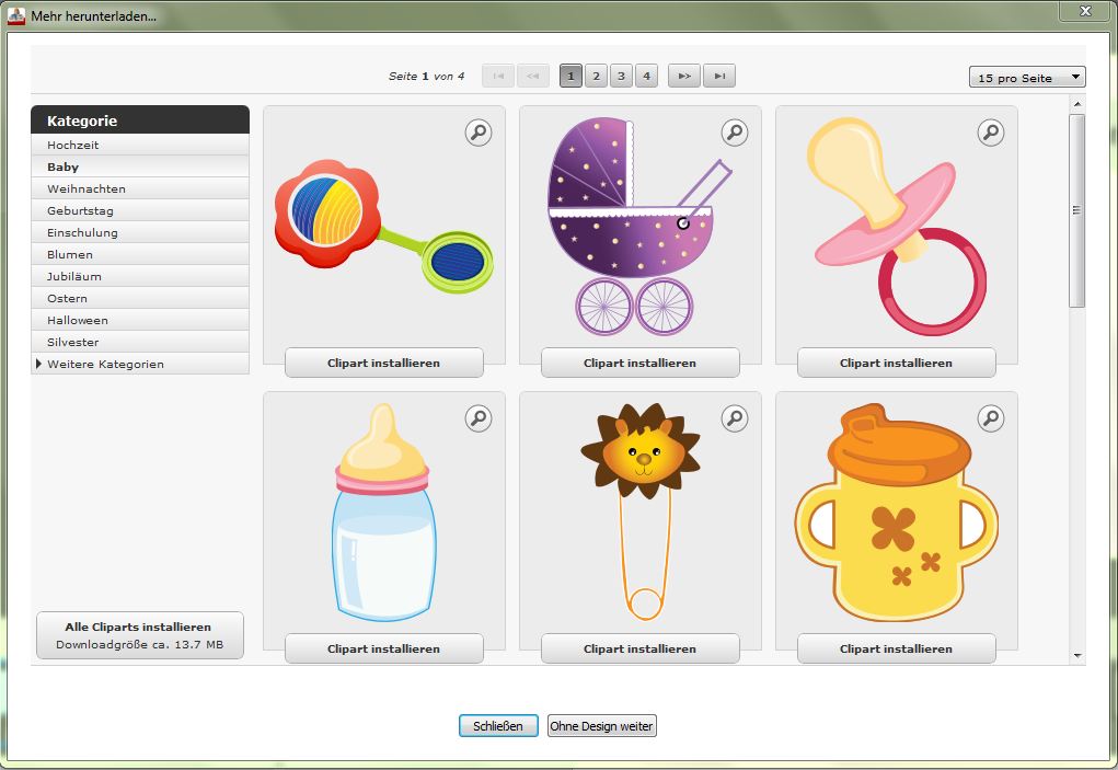 ab Version 4.8 können Sie alle Cliparts und Passepartouts auf einmal installieren.