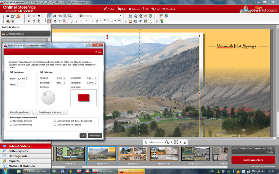ich bedanke mich herzlich für Ihren Bericht. Inzwischen konnten unsere Entwickler das Problem korrigieren und werden die Lösungsversion Anfang des Jahres zur Verfügung stellen. Der Fehler lag eindeutig auf unserer Seite. Sie haben nichts falsch gemacht. Ich freue mich, dass Sie nun ein perfektes Fotoprodukt in den Händen halten können. Ich wünsche Ihnen und Ihrer Familie ein schönes, besinnliches Weihnachtsfest :-) Sylke Re: Version 5.1.3 Farbränder und Schatten einstellen:Sylke hat geschrieben: Liebe KerstinG,