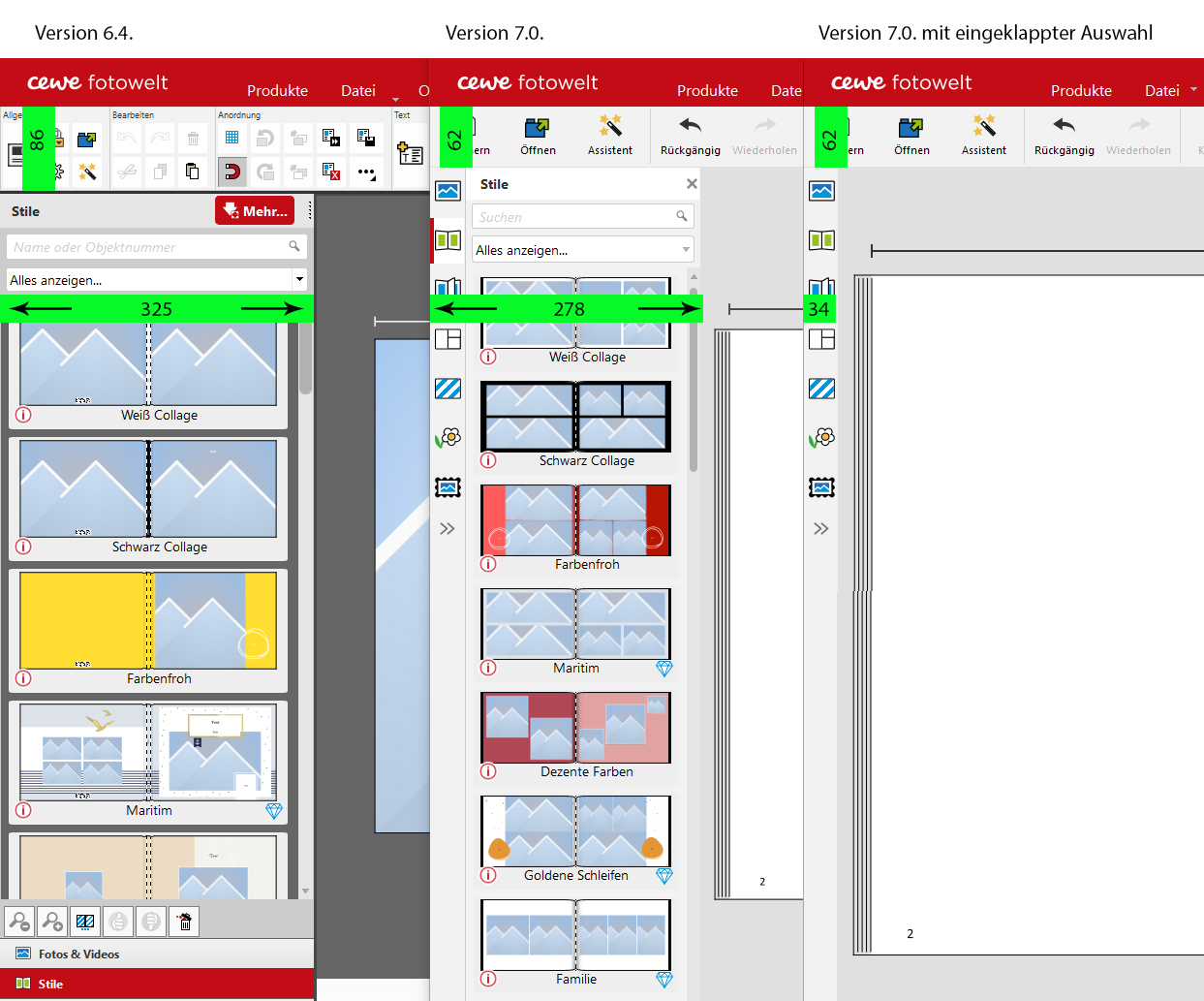 nach dem ersten Start der Software sind alle Paletten komplett geöffnet, um einen ersten Überblick zu gewähren. Ähnlich wie Sie es von anderen Anwendungen vielleicht kennen, können Sie sich einrichten. Das heißt, Paletten verkleinern, nicht relevante oder nicht laufend verwendete Paletten ausblenden usw. Sie haben alles eingeblendet und der linke Bereich ist auch nicht verkleinert. Dadurch haben Sie natürlich weniger Platz in der Breite. Lassen Sie mich mit einer gängigen Auflösung (1920x1200) einen Vergleich anstellen: Die Werkzeugleiste im oberen Bereich ist deutlich schmaler geworden und auch das Storyboard, sofern Sie dieses im unteren Bereich nutzen, lässt sich während der Bearbeitung ausblenden. In der Höhe haben Sie somit deutlich mehr Platz gewonnen. In der Breite ist es ähnlich. Sie können die linke Leiste verkleinern, dann sehen Sie nur die kleinen Icons. Das Auswahlfenster lässt sich, sofern Sie das Minimum noch nicht erreicht haben, etwas zusammen schieben. Wenn Sie die Auswahl nicht mehr benötigen, können Sie die Palette schließen. Im rechten Bereich sind neue Paletten hinzugekommen, die natürlich Platz benötigen. Aber auch diese Paletten lassen sich schließen, wenn Sie z.B. vorrangig mit der Auswahl beschäftigt sind. Ich habe mir meinen Bereich folgendermaßen eingerichtet und hole mir die temporär benötigten Ansichten mit dem jeweiligen Kürzel in den Fokus. Damit habe ich in der Breite 120 Pixel mehr Platz zum Gestalten, als in der vorherigen Version. F5 Miniaturansicht ausblenden F2 Bearbeiten F3 Anordnen F4 Dekorieren Schauen Sie sich gerne einmal Josefias Liste an: ofs/viewtopic.php?p=107289#p107289 Die Informationen hinsichtlich der Softwareänderungen sind aus unserer Sicht richtig platziert, um alle zu erreichen. Es ist uns nicht möglich, über 30.000 Seiten anzupassen, dazu die Mailings und Printmedien. Des Weiteren könnte das Kundenverhalten nicht konträrer sein. Nicht jeder ist online, auf unseren oder unseren Partnerseiten unterwegs und mehr oder weniger über Social Media Kanäle erreichbar. Der gemeinsamer Nenner ist unsere Software. So erreichen wir all unsere Kunden und informieren entsprechend. Sylke