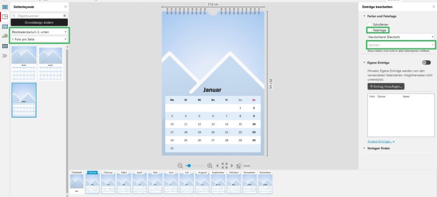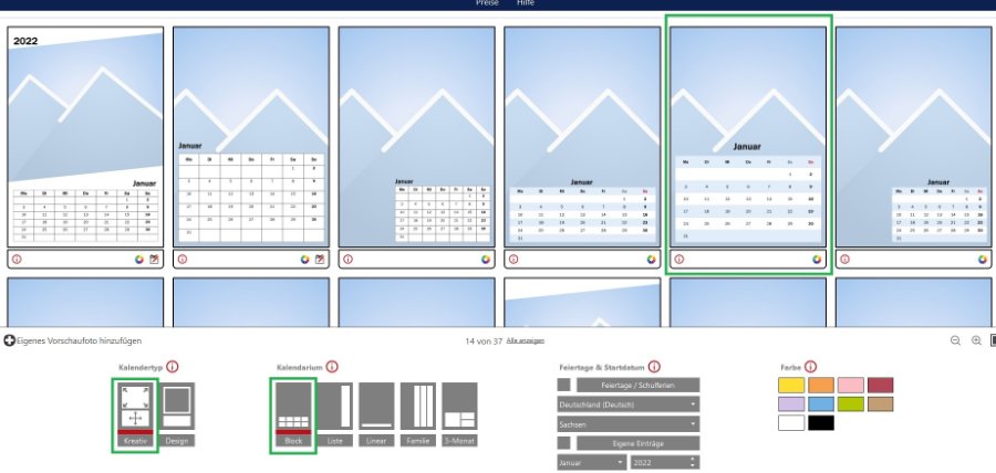 Kalender mit Version 7.1.4: Auswahl: --> Kalender --> Wandkalender A4 --> Hoch --> Digitaldruck Matt --> Weiter (keine Extras) --> Kreativkalender auswählen In der anschließenden Auswahl kannst Du die Vorschläge auf Block-Kalendarium einschränken, wenn Du möchtest. Du kannst dies aber auch ohne Einschränkungen belassen. Bei Feiertage/Schulferien sollte hier noch KEIN Häkchen gesetzt werden, da nicht alle Kalender beides anbieten. Bietet ein Kalender also nur eine Feiertags-, aber keine Schulferienkennzeichnung an, wird er bei einem Häkchen an dieser Stelle leider nicht mehr angezeigt. Die in der ersten Zeile mit Gitternetz gezeigten Kalendarien sind Nr. 1 mit Beschriftung der Feiertage, die ohne Gitternetz gezeigten Kalendarien sind Nr. 2 (bzw. 3 oder 4) ohne Beschriftung der Feiertage. Für Dein angestrebtes Layout passt also das 4. bzw. 5. Design am besten. Es ist jedoch egal, welches Kalendarium Du an dieser Stelle auswählst. Alle können später im Arbeitsbereich wieder nach Wunsch geändert werden. Ich habe für die weitere Erklärung das 5. Layout von links ausgewählt. --> Auswahl verwenden Unter Bearbeiten setzt Du jetzt ein Häkchen bei Feiertage und wählst danach Sachsen aus. Bei markiertem Kalendarium werden unter Bearbeiten nun weitere Eingabemöglichkeiten aktiv. Du entfernst das Häkchen bei Farbwechsel je Woche, veränderst danach alle Flächen einheitlich auf weiß, gibst Samstag und Überschrift Samstag eine andere Farbe und auch Sonntag und Überschrift Sonntag eine weitere andere Farbe. Du setzt ein Häkchen bei Feiertage wie Sonntage färben und entfernst unterhalb der Farbkombinationstabelle alle weiteren Häkchen. ACHTUNG: Das Entfernen des Häkchens bei Schulferien wie Samstage färben aktiviert weiter oben das Häkchen vor Schulferien bei Ferien und Feiertage. Dies muss dort dann wieder entfernt werden, wenn Du keine Anzeige der Schulferien möchtest. Wenn Du eine Anzeige der Schulferien möchtest, muss an beiden Stellen natürlich ein Häkchen sitzen, damit die Ferien angezeigt und farblich gestaltet werden können. Wenn gewünscht, änderst Du noch im Bereich Zeichensatz Schriftart und -größe bzw. belässt es bei den bereits verwendeten Daten. Sobald Du alle Eingaben nach Wunsch vorgenommen und verändert hast, kannst Du die Einstellungen über Weitere Funktionen --> Auf weitere Objekte anwenden --> Alle --> OK auf alle Kalenderblätter übernehmen. --> In Deinem gezeigten Layout stehen die Monatsnamen linksbündig mit einem weiteren Text in der selben Zeile. Die Blockkalendarien 2 und 3 setzen den Monatsnamen jedoch mittig. Hier habe ich zwei Vorschläge, wie Du die Monatszeile trotzdem nach Deinen Wünschen gestalten kannst. Idee 1) Du markierst die Zeile mit den Monatsnamen, schiebst sie außerhalb des Kalenderblatts in den grauen Bereich und bestätigst den Warnhinweis mit Liegen lassen. Dies führt bei Übergabe in den Warenkorb später zu einer entsprechenden Warnmeldung, Idee 2) Du markierst die Zeile mit den Monatsnamen und setzt die Schrift auf Keine Farbe. Bei beiden Ideen legst Du anschließend eine neue Textzeile an, die Du so mit Monatsnamen und weiterem Text gestalten kannst, wie Du es möchtest. ACHTUNG: Hier musst Du unbedingt selbst darauf achten, dass der richtige Monatsname auf dem richtigen Kalenderblatt steht. Dieses eigene Textfeld wird nicht von der Software auf Korrektheit geprüft. An dieser Stelle kannst Du Deinem Fotoplatzhalter jetzt bereits Rahmen und runde Ecken und weitere Gestaltungsvarianten geben, die auf allen Kalenderblättern gleichermaßen angewendet werden sollen. Ist das erste Kalenderblatt vollständig nach Deinen Wünschen gestaltet, speicherst Du es über den Reiter Anordnen als eigenes Layout. Über Seitenlayouts --> Eigene Layouts kannst Du es wieder abrufen und von dort auf alle Kalenderblätter gleichzeitig legen. Abschließend bestückst Du die einzelnen Blätter mit Deinen Fotos und Texten und kannst dann den Kalender speichern und bestellen. Ich hoffe, dies hilft Dir weiter. Wenn Du weitere Fragen hast, melde Dich gern. In Version 7.2.2 ist der Einstieg etwas anders, aber sobald Du im Arbeitsbereich bist, sind alle Eingaben und Gestaltungen genauso wie oben beschrieben und gezeigt. Liebe Grüße