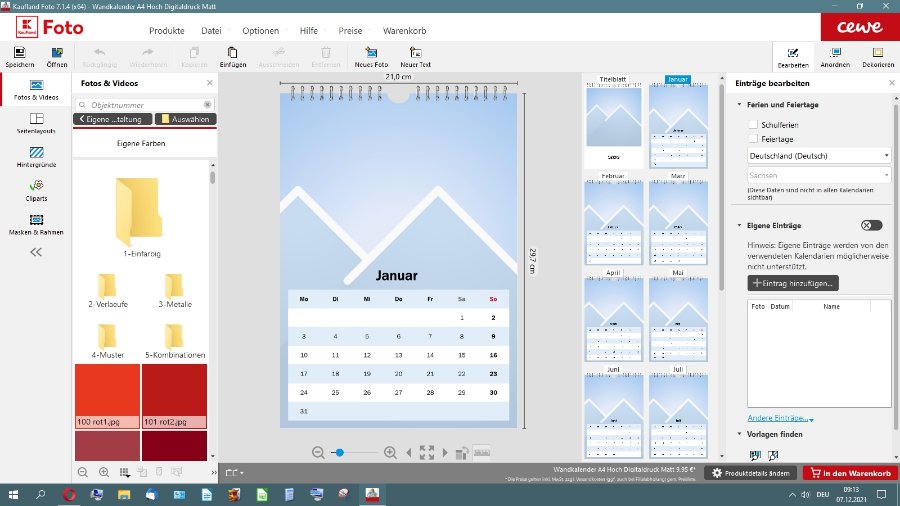 ich werde mich sofort melden wenn der erste Kalender angekommen ist. Die Ungereimtheiten lassen mir keine Ruhe. Deshalb habe ich das Kalendarium Januar aus meinem Muster kopiert und auf den folgenden Seiten eingefügt. Die Kalenderdaten wurden korrekt fortgeschrieben, jeder Monat hat die richtigen Daten. Ich habe danach die halbfertige Seite Januar mit der Gummibandmethode markiert, kopiert und bei Dezember eingefügt. Auch dabei ist Alles korrekt abgelaufen. Der Dezember hat die Dezemberdaten und meinen Layoutentwurf. Ich brauche nur noch das Bild zu ändern. Diese Methode ist zwar primitiv, funktioniert aber. Wenn die Arbeit am Kalender 2022 richtig beginnt, trage ich noch Monat und Bildunterschrift sowie Dekorierung ein. Dann ärgere ich mich nicht mehr über die Software!!! Gruß Reisender PS: Ich bin nicht überzeugt, dass das Problem der Bearbeitung des Kalendariums mit dem aktuellen Update gelöst wird. Re: Fehlermeldung beim WarenkorbHallo spica,