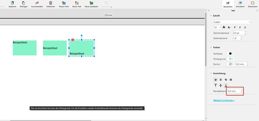 BuJa2022 Re: V731: Rand-/Innenabstand wird immer wieder zurückgesetztVon mir folgende Ergänzungen zum wechselnden Innenabstand bei Textfeldern (Version 7.3.1 , Anbieter Cewe, Format Panorama groß, Digitaldruck matt)