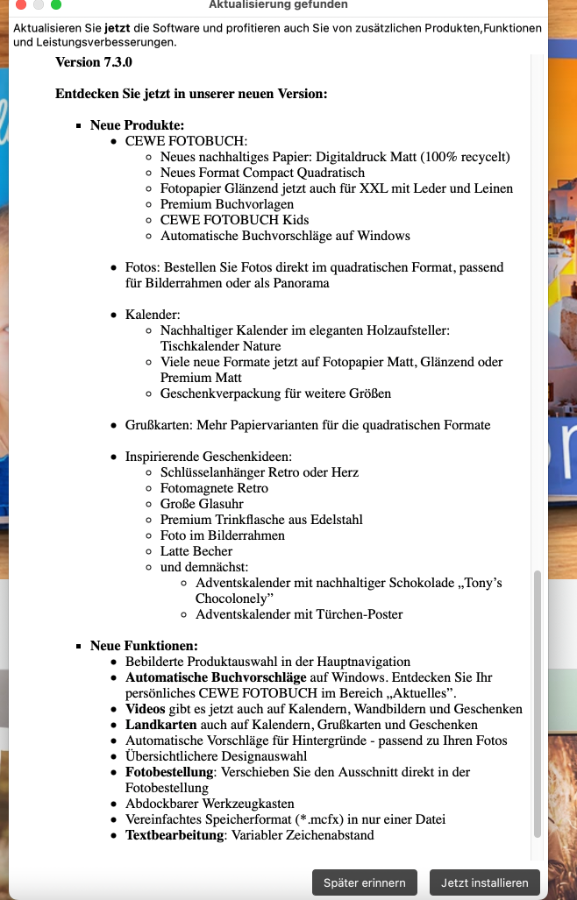 ich habe mir mal für Testzwecke die Version 7.3.0. auf den Mac herunter geladen. Ich arbeite aber noch mit der 712. Wenn man diese öffnet wird man ja zum Update aufgefordert und zu den jeweiligen Versionen gibt es Hinweise zu den Änderungen (siehe beigefügter Screen Shot). Hier sind wesentlich mehr Punkte aufgeführt als in der Vorankündigung von Katharine hier im Forum. Hier gibt es den Punkt unter Neue Funktionen: Automatische Vorschläge für Hintergründe - passend zu Ihren Fotos Ich habe diesbezüglich nichts gefunden. Ist da jemand von euch schon fündig geworden? Danke und euch allen viel Spaß beim beliebten Spiel: Wer findet die Änderungen! Viele Grüße