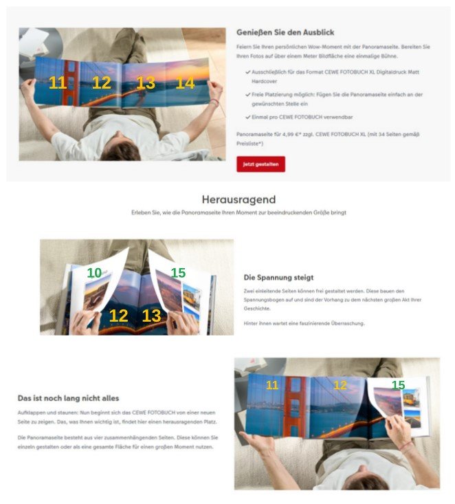Gut, dass ich nachgefragt habe. Ich wäre tatsächlich der Annahme gewesen, dass auf den Seiten 9 + 10 und 15 + 16 keine Bilder zu platzieren wären, da sie noch zur Panoramaseite gehören. Da ich es von der Darstellung her so gesehen habe. Das hat mich aber schon irritiert. Ich denke, da war ich bestimmt nicht die Einzige. Gruß