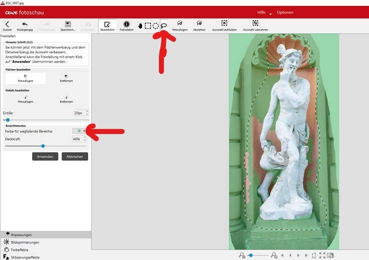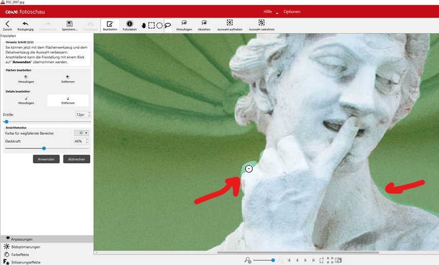 Also, als Grundlage kann ich das youtube-Video von Cewe empfehlen: https://www.youtube.com/watch?v=optGgdOWkMw Damit alleine bin ich aber noch nicht klargekommen. Meine Tips: - nicht zu viel erwarten vom Tool "Flächen freistellen", das nimmt manchmal einfach zu viel oder zu wenig weg. Ich nutze es nur bei wirklich großen Flächen. (Bild1) - unter "Ansichtsmodus" eine wirklich kontrastreiche Farbe einstellen, Deckkraft nehme ich ca. 50 %. Die Farbe ändere ich auch mal zwischendurch. - Mit dem Maus-Rad das zu bearbeitende Motiv so groß wie möglich stellen und dann die Details bearbeiten. Auch den Pinsel sehr breit einstellen, das geht viel leichter. Je dünner der Pinsel um so zittriger wird es. (Bild 2) - Merke: Hinzufügen für das Motiv, Entfernen für den Außenbereich. - Für die winzigen Details nehme ich dann den dünnen Pinsel. (Bild 3) - Keine Angst, wenn man mit dem breiten Pinsel zu viel weggenommen hat, man kann es ja wieder zufügen. Der Kreis gibt schöne, gerade Linien. (Bild 4) - Ich gehe nochmal über die großen Flächen, um nichts zu vergessen, dann "anwenden". Manchmal hat sich doch ein Fleckchen eingeschlichen, macht nichts, mit "rückgängig" bin ich wieder im Bearbeitungsmodus und kann ausbessern. (Bild 5) Vielleicht hat jemand ja noch weitere Tricks. Dann wünsche ich allen viel Spaß beim Freistellen. Einfach mal probieren. LG Monika