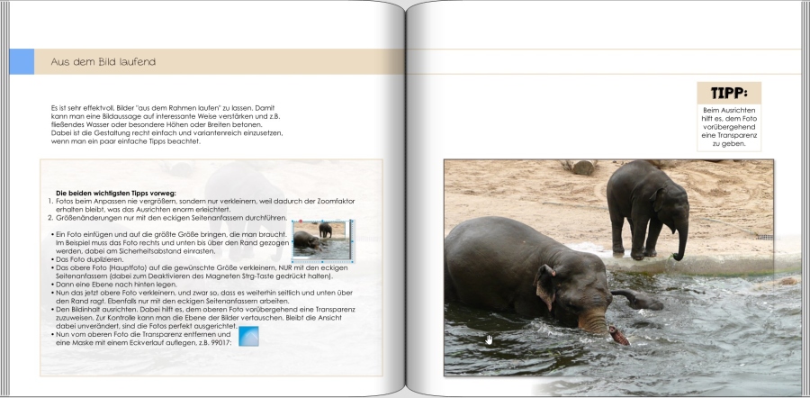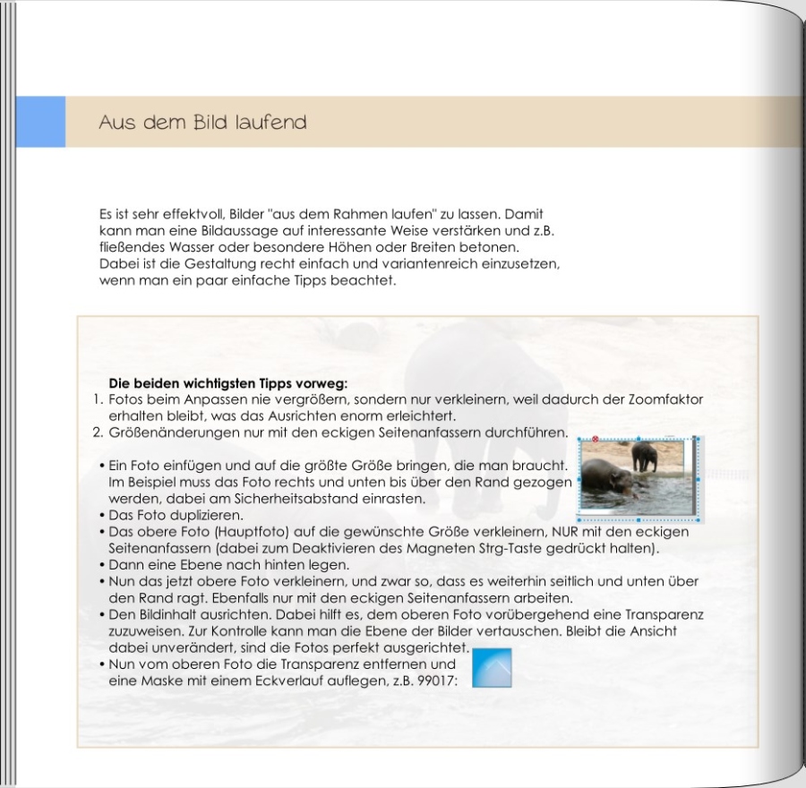 Ich möchte ein Foto im Buch mit dem selben Motiv noch einmal übereinander legen. Quer und dann mit Verlauf und einem Rahmen. Problem ist: Man muss ja die beiden Fotos exakt auf die selbe Größe bringen um sie genau Deckungsgleich übereinander zu legen. Mit der Zoomfunktion ist es immer ein bisschen kleiner oder größer wie ich es brauch, auch wenn ich den Rahmen größer ziehe. Kann man das irgendwie feiner einstellen? Oder ist meine ganze Herangehensweise falsch? Grüße Carsten Re: Foto zoomenHallo Carsten,