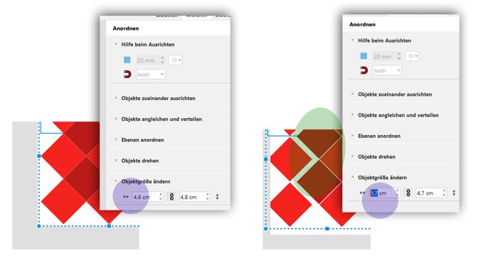 Ich habe eine flächige Gestaltung von Quadratem, die mit der Eckenoption auf Rhomben zugeschnitten sind. Am linken Rand liegen sie sehr knapp am Seitenrand. Der Magnet ist ausgeschaltet. In den Optionen habe ich für alles "keine Nachfrage" eingestellt. Ich markiere ein paar Vierecke und verkleinere sie (Anordnen -> Objektgröße) um 1 mm. (siehe lila Fläche) Alle Vierecke werden um 1 mm verkleinert, die nah beim Rand gelegenen springen zu weit nach links - scheinbar im Bemühen mich vor Blitzern zu bewahren (siehe grüne Fläche). Re: Formatänderung lässt Blitzer entstehen?spica hat geschrieben: