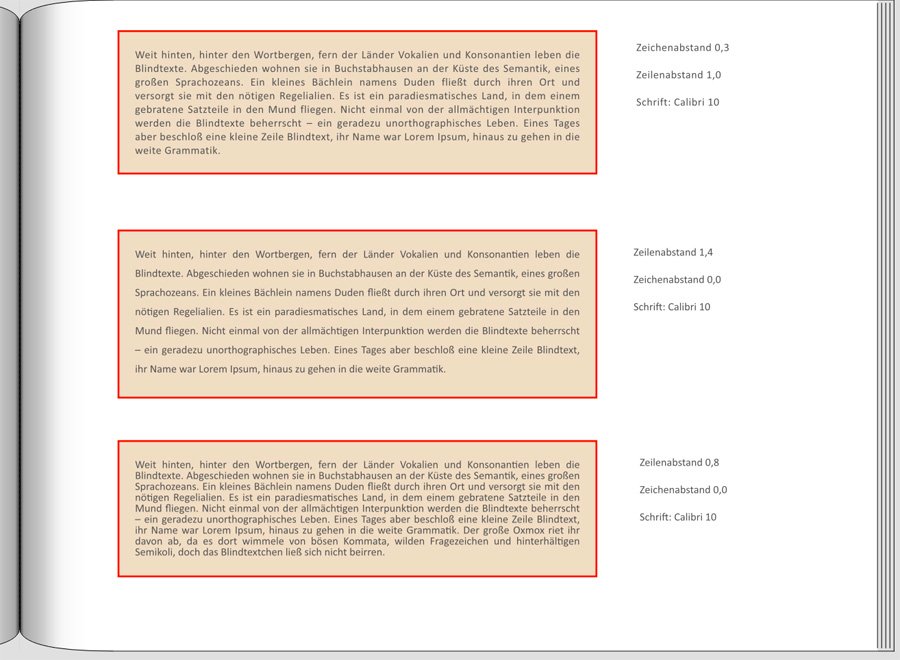 Versionsnummer: 7.3.1 Handelspartner: CEWE Beschreibung: In diesem Thread haben wir schon ausführlich beschrieben, dass der Randabstand bei Textfeldern durch das Kopieren/Einfügen einer (Doppel-)Seite immer wieder zurückgesetzt wird. Ähnliches passiert auch mit dem Zeichenabstand beim Duplizieren einer Doppelseite auf die nächste leere Seite. Hier wurde in beiden Textfeldern der Zeichenabstand von -0,1 pt auf 0,0 pt erhöht. Besonders deutlich wird das bei dem Textfeld auf der linken Seite, weil hier durch den erweiterten Zeichenabstand eine Zeile hinzugekommen ist und der Text weiter nach unten reicht. Der Innenabstand beträgt bei allen Textfeldern 0,0 mm, darunter liegt ein Clipart Farbe. Den Text im zweiten Beispiel habe ich zwar aus dem Internet gezogen, aber alle Formatierungen durch das Zwischenspeichern in "Notepad" vorher entfernt. Liebe Grüße