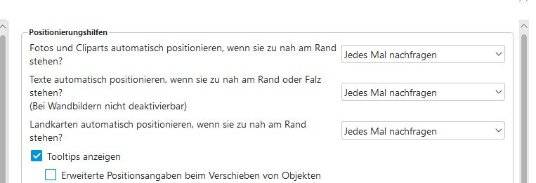 Danke Spica für den Verbesserungsvorschlag. Positionierungshilfen.jpg Ich gestalte Fotos gern bis in den Falz hinein und muss aktuell dauerhaft die entsprechende Warnmeldung einzeln wegdrücken. In den Optionen kann ich nur gleichzeitig die Warnmeldung für den Rand bearbeiten. Für den Rand möchte ich aber die Warnmeldung behalten, um Blitzer zu vermeiden. D.h. wünschenswert ist hier eine separate Auswahl für Falz und Rand und keine gemeinsam gültige. Vielen Dank. Liebe Grüße Asiafan