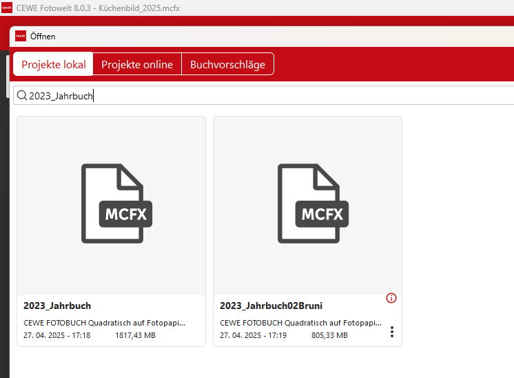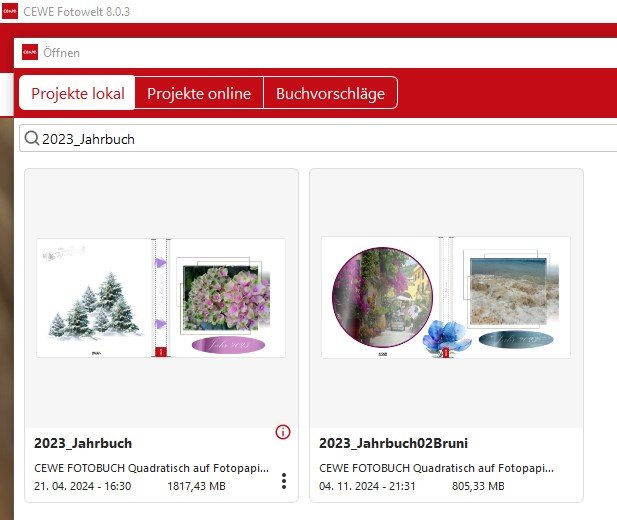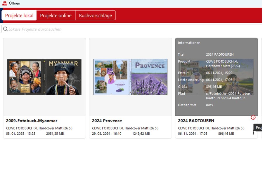 Re: Meine Projekte > Alle Projekte anzeigenJetzt habe ich auch mal bei mir nachgesehen, ich sehe alle Vorschaubilder, auch die mcfx abgespeicherten. Sie sind auch sofort sichtbar. Meine mcfx Dateien sind genau dort, wo ich auch das Buch gestaltet habe auf der internen Festplatte. Ich arbeit unter WIN 11 immer mit der neuesten Version, also mindestens einmal im Monat ein Patch-Update. Möglicherweise liegt es ja an einer Windows Einstellung. Früher z.B. konnte ich die Thumbnail-Vorschau bei PSD Dateien als Foto sehen, jetzt nur mehr das Logo PSD. Laut Adobe liegt dies an Windows.