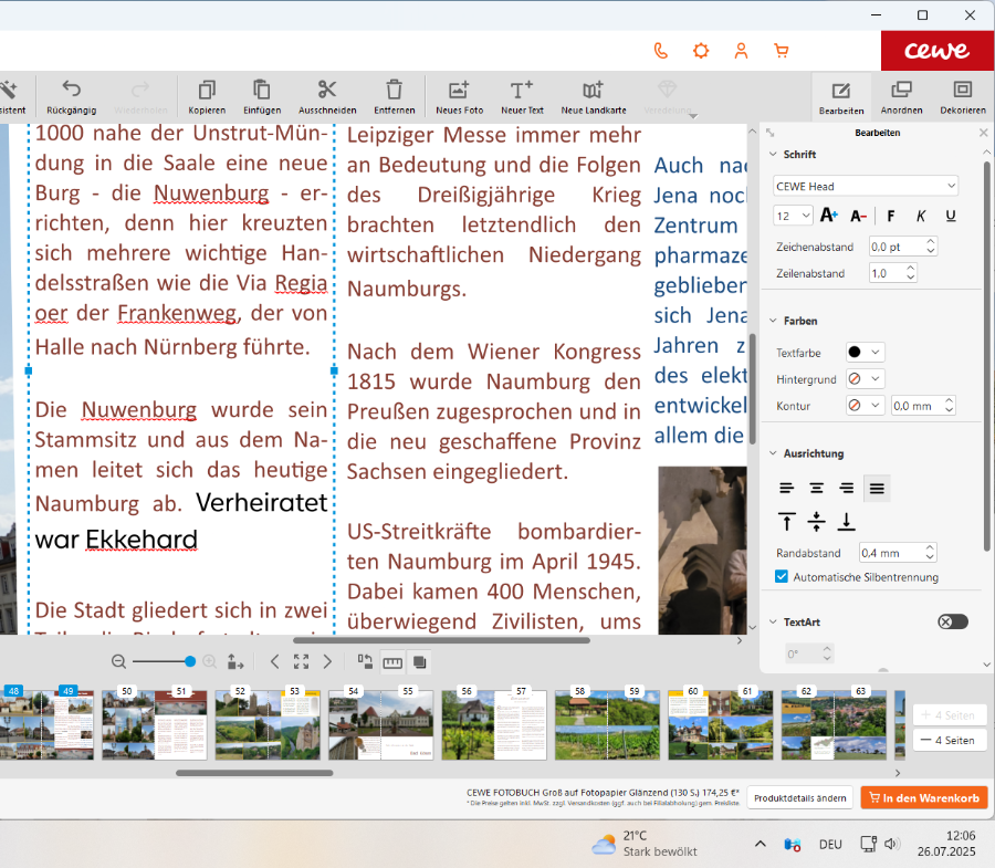 Hallo Thorben,wir können die von euch beschriebenen Schwierigkeiten mit der Version 8.0.4 nicht nachstellen. Deshalb interessiert es uns, wie es sich bei euch mit einem ganz neu begonnen Projekt in der 8.0.4 verhält, da wir vermuten, beide Projekte wurden mit einer Vorgängerversion begonnen. Nur um damit zu testen, ob es auch in einem Projekt ausschließlich aus der 8.0.4 auftritt. Wenn es in einem neuen Projekt mit der 8.0.4 nicht auftritt, wird der Fehler sich wie auch von Silber-Distel vermutet noch von der alten Version im Projekt festgesetzt haben. Dann wäre es für das restliche Projekt notwendig, die Schriftart und Größe nach dem Einfügen nochmals anzupassen. Einzig könntest du noch versuchen, ob ein Einfügen mittels "Strg + Umschalttaste + V" hilft. Bei dem Befehl, statt des üblichen Tastenbefehls zum Einfügen "Strg + V", wird die Text-Formatierung gelöscht. Auch hinsichtlich der von Reisetante beschriebenen Veränderung nach dem Zeilenumbruch wurde dies eigentlich schon mit der Version 8.0.3 behoben. Das Thema dazu findet sich hier, auch mit einem Workaround für vor der Version 8.0.3: viewtopic.php?f=2&t=16444 Liebe Grüße Thorben Entwarnung! Bei meinem geschilderten Problem handelte es sich nicht um ein CEWE-Problem. Ich habe herausgefunden, dass sich die Formatierung des Editors verändert hatte. Möglicherweise ist das bei einem Windows-Update erfolgt, ich habe jedenfalls dort nichts verändert. Nachdem ich alle im Editor vorhandenen Texte in mein Projekt eingefügt hatte, habe ich die Formatierung gelöscht und dann neu formatiert. Und siehe da, jetzt funktioniert es wieder wie gehabt. Es tut mir leid, dass ich eurch unnütz beschäftigt habe. Liebe Grüße Traumfänger