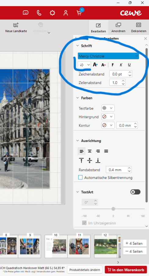 Versionsnummer: 8.0.4 Handelspartner: Cewe Beschreibung: Ich arbeite inzwischen mit 8.0.4, habe mein angefangenes Projekt geöffnet und nun festgestellt, dass ich die Schriftgröße nicht mehr ablesen kann. Bei Überschriften habe ich auch mal zweistellige Zahlen und diese sind nicht mehr auf den ersten Blick sichtbar. Das war früher nicht so. Man muss mit dem Cursor ins Feld und nach rechts - links schieben. Ich hänge mal einen Screenshot an. Gruß Monika Vorgehensweise: 1. ...Version 8.0.4 installiert 2. ...begonnenes Projekt geöffnet 3. ...