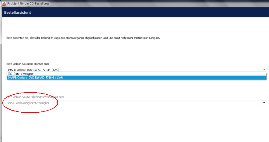 lässt sich denn dein Brenner nicht anwählen? Ich kann bei deinem Screenshot nicht erkennen, ob der Auswahl-Pfeil ganz rechts neben "ISO-Datei erzeugen" aktiv oder grau ist (liegt an meinem aktuell zu kleinen Bildschirm). Ich habe ebenfalls die dm-Version installiert und bei mir lässt sich sowohl der Brenner anwählen und die CD brennen als auch die ISO-Datei erstellen, falls ich ohne den Brenner zu wählen auf weiter klicke. Dein Problem könnte daher sehr verschiedene Ursachen haben. Gib doch bitte zunächst mal Bescheid, was passiert, wenn du versuchst, den Brenner auszuwählen, ob das möglich ist und wie weit dann ggf. die Bestellung vorangeht. liebe Grüße