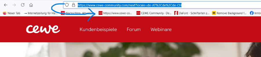 Genauso funktioniert es vielleicht kannst du es mal mit dem Link versuchen, über den ich ins Internet gehe. Ich habe diesen Link jetzt einfach mal kopiert, ob das allerdings auch von Österreich aus klappt, kann ich nicht beurteilen. https://www.cewe-community.com/next?loc ... de%2Cde-CH Den Link habe ich dann in der oberen Zeile fixiert, dann klappt es bei mir. Screenshot (246).png Viel Erfolg! Und wenn es nicht klappt, noch solange Geduld, bis die Urlaubszeit vorbei ist. Liebe Grüße Traumfänger Anika, speichere mal den Link als Lesezeichen in der Symbolleiste. Beim Aufrufen wird dann künftig immer dieser Link geöffnet LG