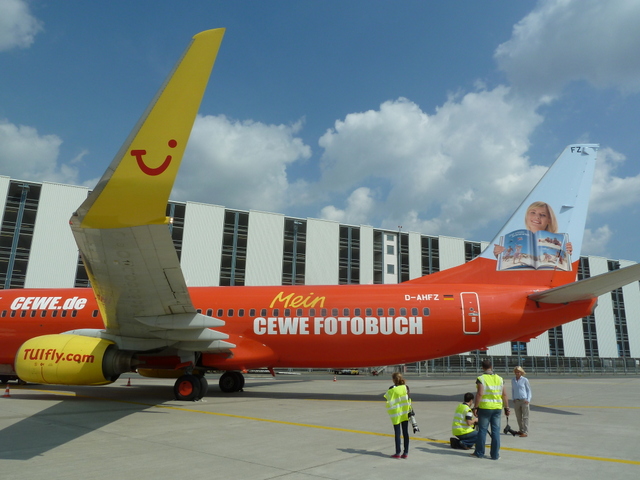 TUIfly Boeing 737-800 in einem einzigartigen CEWE FOTOBUCH Design „CEWE AIR“ auf den TUIfly Strecken über den Wolken unterwegs TUIfly kann Zuwachs bei den Fliegern mit Sonderlackierung begrüßen. Eine Boeing 737-800 der TUIfly ist ab sofort in CEWE Sonderlackierung über den Wolken unterwegs. Die „CEWE AIR“ fliegt für TUIfly drei Jahre zu den klassischen Urlaubsregionen rund um das Mittelmeer, auf die Kanarischen Inseln, auf die Kapverden, nach Madeira und Ägypten. Insgesamt rund neun Tage war das Flugzeug in der Lackiererei in Dublin. Nach der Lackierung muss die Farbe zehn bis zwölf Stunden trocknen, bevor der Flieger wieder in die Luft gehen kann. Hier ein paar Bilder aus Dublin (mit freundlicher Genehmigung von CEWE):
