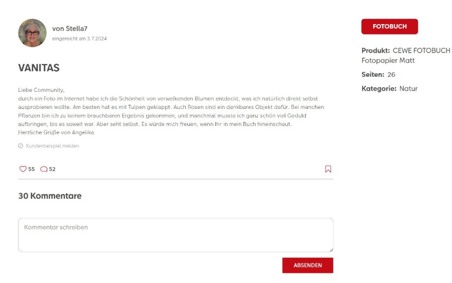@Traumfänger, vielen lieben Dank für Deine Erklärungen! Ich kann total verstehen, wie blöd das für Euch Österreicher:innen ist, wenn nicht mehr alle deutschsprachigen Beispiele angezeigt werden, sondern nur diese, die dem jeweiligen Browserstatus des Landes angezeigt werden. Den Fakt, dass österreichische Kundenbeispiele eventuell benachteiligt werden könnten, weil sie nicht direkt von der deutschen Community gesehen werden, haben wir wahrscheinlich gar nicht so gesehen. Manchmal sind auch wir ein wenig "betriebsblind". Deshalb ist es ja so wichtig, dass Ihr als tägliche Nutzer:innen der Community Eure Gedanken dazu hier teilt. Wie Traumfänger schon erwähnt hat, ist auch bei CEWE Schulferienzeit, weshalb viele Mitarbeitende im Urlaub sind. Ich schreibe trotzdem zu jedem Eurer Anliegen ein Ticket, welches dann schon auf Tino nach seinem Urlaub wartet und dann besprochen wird. Ich möchte Euch trotzdem nochmal darauf hinweisen, dass manche Wünsche und Anregungen schneller umzusetzen sind und manche ihre Zeit brauchen. Ich sehe all Eure Anliegen, auch wenn ich nicht immer direkt auf jedes einzeln reagiere und melde mich zu den einzelnen Themen, sobald ich News habe. Habt einen schönen Start in die Woche! Viele Grüße