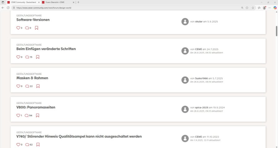 Ich finde die neue Seite sehr unübersichtlich. Man muss ständig herumscrollen. Auch wenn man von der Kachelansicht auf die Listenansicht geht, bekommt man wesentlich weniger Informationen auf einen Blick als beim alten Forum. Hier mal zwei Screenshots zum Vergleich (Thema Gestaltungssoftware): Dass die Kundenbeispiele nicht mehr korrekt angezeigt werden, wurde bereits gestern im neuen Forum aufgezeigt und von mir auch ergänzt. Und warum bekommt man Unterschiedliches, je nachdem, ob man via PC oder Smartphone auf die Seite zugreift? Auf der Startseite sieht man als "Produkt der Herzen" - wenn man sich endlich so weit durchgescrollt hat - * auf dem PC das meistgeherzte Buch (Griechenland von uweber mit 192 Herzen) * auf dem Smartphone das meistgeherzte Buch (irgendwo in Mexiko von Sabine01 mit 109 Herzen). Ist das wieder so ein Österreich-Malus? Ich werde mich an das neue Kinderzimmer gewöhnen (das ohnehin vor allem aus Luft besteht und in dem man viel herumlaufen muss, um Teile der alten Einrichtung zu finden). Aber gerne darin wohnen? Ich weiß nicht ... LG Basilikum