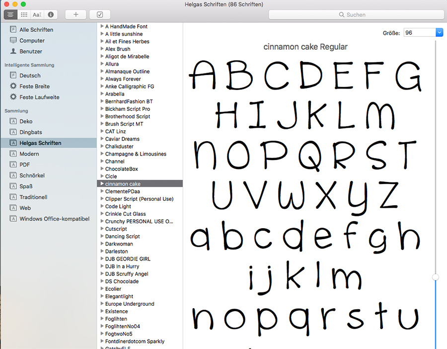 Liebe Hellen,Mein Credo ist ja: weniger ist mehr! Das vorweg. Aber der Reihe nach: ich gehöre auch zu der Spezies Sammler und Jäger. Daher habe ich mir bei meinen vielen Fonts ein paar Unterkategorien angelegt (weißt du, wie das auf dem Mac geht?): Handschriften, Schnörkelschriften, Dekorative Schriften, Dingbats, Schriften für Fließtext, ausländisch anmutende Schriften..... Da ist man ja ganz frei in der Gestaltung. Und in diese Unterkategorien ordne ich meine Schriften ein. Wenn ich eine Schrift suche, kann ich auf die jeweilige Unterkategorie zugreifen und stöbern. In der cewe SW tippe ich nur den ersten Buchstaben des Schriftnamens ein und suche mir dann den ausgewählten Font aus. Fertig. LG Hellen nein wie man auf dem Mac Unterkategorien anlegt, weiss ich nicht, klingt aber interessant! Vielleicht hast du ja mal Zeit, das hier genauer zu erklären! Bäuerin hat geschrieben: Liebe Zaubermaus,