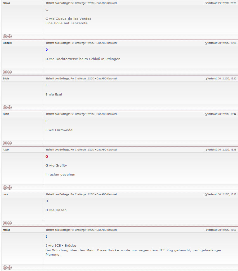 Wir laden Sie herzlich ein, die neue CEWE Community mit integriertem Forum zu entdecken und künftig zu nutzen. Das bisherige Forum, in dem Sie sich gerade befinden, steht nur noch bis Ende 2025 für neue Beiträge zur Verfügung und wird ab dem kommenden Jahr 2026 nur noch lesend zugänglich sein. Informieren und registrieren Sie sich jetzt in der neuen CEWE Community – wir freuen uns auf Sie! ABC-KarussellNach 5 Monaten in meiner USA Heimat, bin ich wieder in good old Germany. Jetzt moechte ich beim ABC-Karussell mitmachen, soll ja gut für mein 80 jaehriges Gehirn sein. Da mir mit X kein deutsches Wort einfaellt, wollte ich mir Tipps vom gleichen Spiel des letzten Jahres holen. Da ist mir aufgefallen, dass eine Person (en)? im minuetlichen Abstand Bilder postete, die jetzt alle weg sind. Dies waren sicherlich so 100 Eintraege, immer mit den gleichen Person(en) direkt hintereinander. Was sollte das? Hier nur zwei Eintraege dazu: