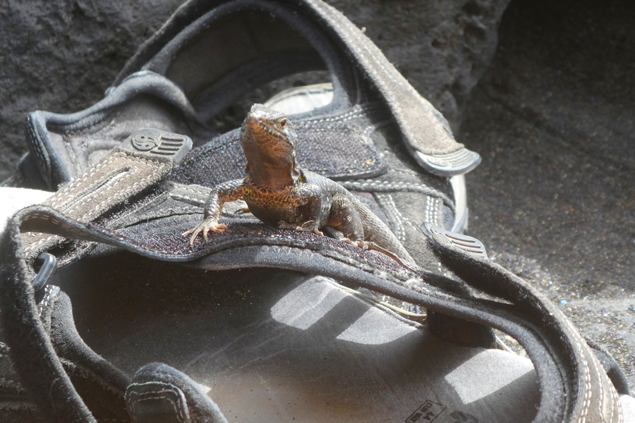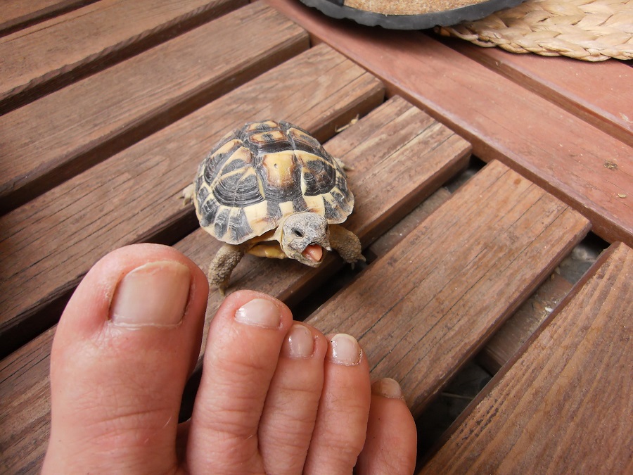 Sie hatte gerade gefressen und war auf Verdauungsspaziergang. Obwohl die Fußnägel nicht rot waren, haben sie sie interessiert. Schildis lieben rot - es könnte ja eine Tomate oder Erdbeere sein. Sie war immer seeeeeehr neugierig, als sie noch klein war.