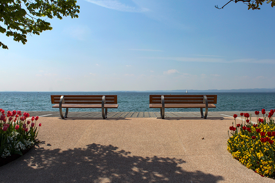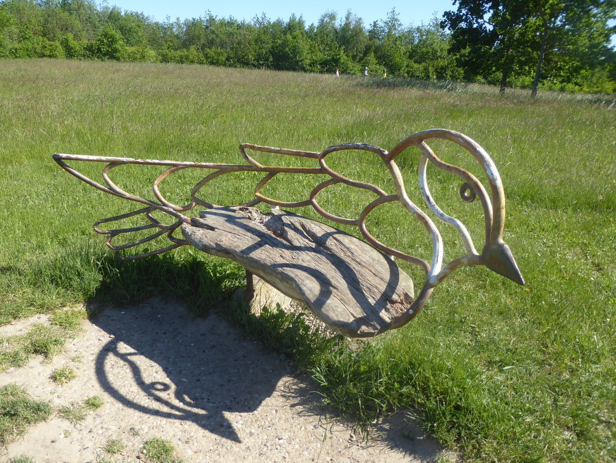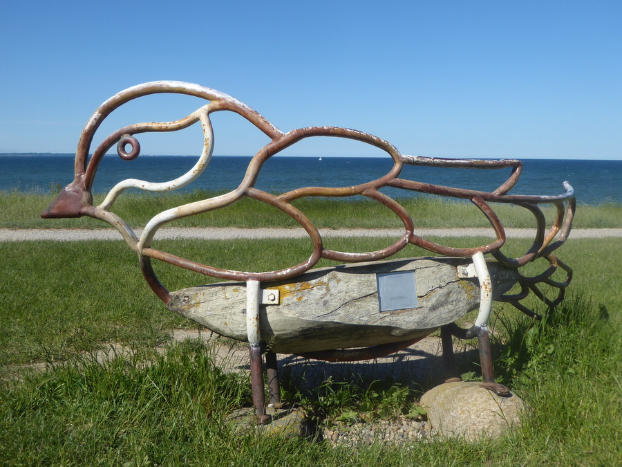 Hier kann man eine Auszeit nehmen, wo einst schon Thomas Manns Romanfigur Tony Buddenbrook ihren Blick über die Ostsee hat schweifen lassen. Die Sitzbank gehört zur Serie der Travemünder SESSEL-LANDSCHAFT des Künstlers Guillermo Steinbrüggen In diesem Fall ist das Motiv eine Uferschwalbe. Im Zuge des Höhenweges laden noch Eule, Feldhase, Ostseehering und Wolf zu einer Verschnaufpause ein.
