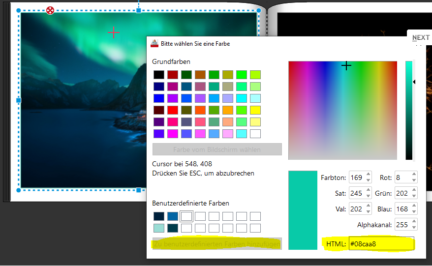 Sylke hat in Ihrem Bild Eins 5 Punkte eingezeichnet und diese durch Linien verbunden. Die Punkte entsprechen in ihrer Farbe exakt der daneben befindlichen Farbleiste. Wie hat sie die Farben ausgelesen? Im Bild Zwei ist ein Fadenkreuz zu sehen, um die Farbe auszulesen. Wie kann ich das mit der CEWE-Software auch machen? Unten ist dann die Farbe als benutzerdefiniert gespeichert und damit für andere Gestaltungen verwendbar. Mit dem Vorgang benutzerdefiniert bin ich vertraut. Wenn ich die Lösung kenne, würde ich auf die externe Zusatzsoftware "Farbpicker" verzichten können. Gruß Reisender Hallo Reisender, das ist ganz einfach. 1. Ziehen Sie Ihr Bild auf eine Doppelseite. 2. Klicken Sie z.B. bei "Farbrand" auf das Farbfeld, um das Fenster "Bitte wählen Sie eine Farbe" zu öffnen. 3. Das Fensterchen öffnet sich. 4. Klicken Sie dann auf "Farbe vom Bildschirm wählen". 5. Sie sehen dann ein kleines Fadenkreuz. Fahren Sie damit über Ihr Bild und klicken Sie auf einen Bildbereich, wenn Sie die richtige Farbe gefunden haben. 6. Wählen Sie im Fenster dann die Funktion "Zu benutzerdefinierten Farben hinzufügen". Ihre aufgenommenen Farben werden dann gespeichert. Zu Punkt 2: Sie können das Fensterchen über "Farbrand, "Textbearbeiten", "Cliparts einfärben" etc. aufrufen. Der Weg ist im Grunde egal. Die aufgenommenen Farben werden gespeichert und sind dann über alle Wege abrufbar. Wenn Sie lieber mit einem externen FarbPicker arbeiten, können Sie den Hexxadezimal-Wert ebenfalls in dem Fenster "Bitte wählen Sie eine Farbe" eingegeben (suehe Markierung unten rechts) und mit "Zu benutzerdefinierten Farben" speichern. Sylke Re: Gewinnspiel: True Colors!Sylke hat geschrieben: 1. Ziehen Sie Ihr Bild auf eine Doppelseite. 2. Klicken Sie z.B. bei "Farbrand" auf das Farbfeld, um das Fenster "Bitte wählen Sie eine Farbe" zu öffnen. 3. Das Fensterchen öffnet sich. 4. Klicken Sie dann auf "Farbe vom Bildschirm wählen". 5. Sie sehen dann ein kleines Fadenkreuz. Fahren Sie damit über Ihr Bild und klicken Sie auf einen Bildbereich, wenn Sie die richtige Farbe gefunden haben. 6. Wählen Sie im Fenster dann die Funktion "Zu benutzerdefinierten Farben hinzufügen". Ihre aufgenommenen Farben werden dann gespeichert. nach dem wiederholten Lesen der Antwort von "DSL-schnell" und der Reanimierung der letzten grauen Zellen habe ich gestern noch die Lösung gefunden. Danke für Ihre Antwort. Gruß Reisender Re: Gewinnspiel: True Colors!Hallo Reisender,