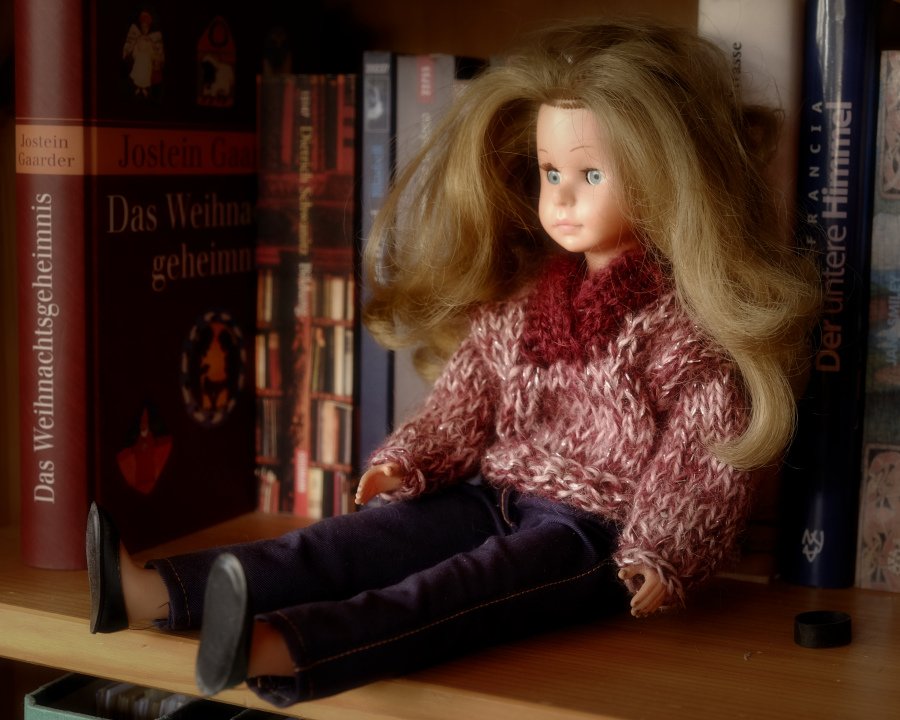 Der Versuch, eine Alternative zur aufkommenden Barbie auf den Markt zu bringen. Eine Puppe mit normaleren Proportionen, und vor allem mit einer Größe, dass ich ihr auch gut selber Kleidung herstellen konnte. Bei den Barbies war das ja so fiselig klein. Jenny kam natürlich viel später als Peki und Tapp. Hier kann ich schon stricken und sogar mit der Nähmaschine meiner Mama umgehen. Alles selbst gemacht! Wobei ich mich gerade frage, ob ich diese Sachen nicht sogar erst später gemacht habe. Mit zehn oder so konnte ich noch nicht so gut nähen und stricken. Sie wohnt seit ewig in einem Bücherregal. Viele Grüße - Gletscherfrau