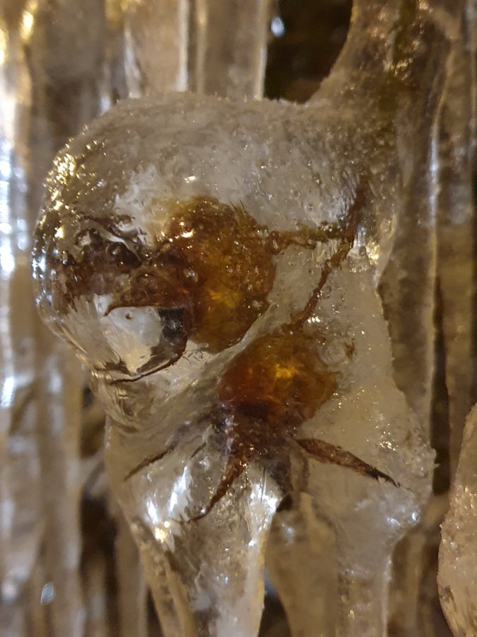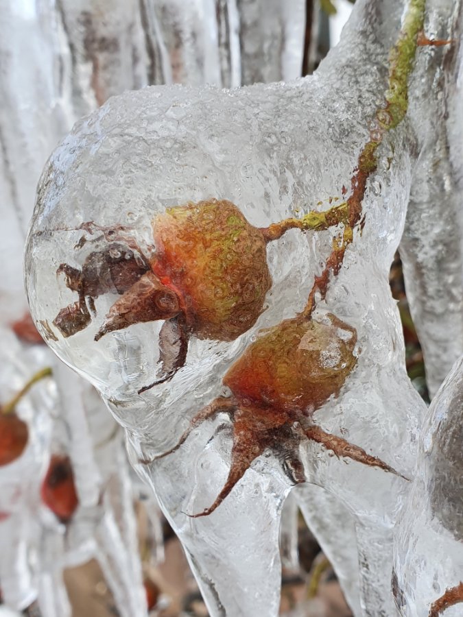 Re: Challenge 03/2021 • Zwei Mal täglichDiese von einer dicken Eisschicht überzogenen Hagebutten hatten mich Anfang Januar auf meiner Spazierrunde total fasziniert, so dass ich diese abends (vor der Ausgangsbeschränkung, die seinerzeit galt) und tagsüber in unzähligen Fotos festgehalten habe. Täglich hat man Veränderungen gesehen. Bis der Ast unter der Eislast abbrach, leider.