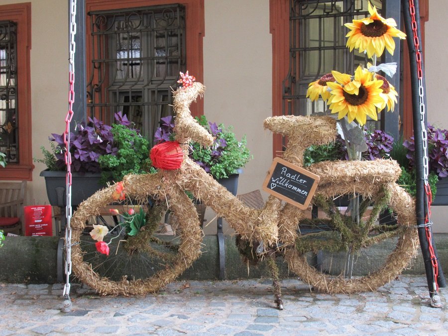 Kunigunde Re: Gewinnspiel: Der Jakobsweg im WesterwaldDas erste Foto ist entstanden bei einem Städtetrip in Bamberg, Fahrrad als Werbeträger für Radler, eingewickelt in Stroh.