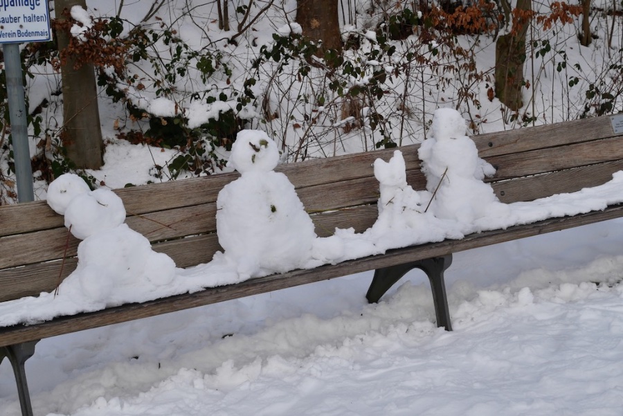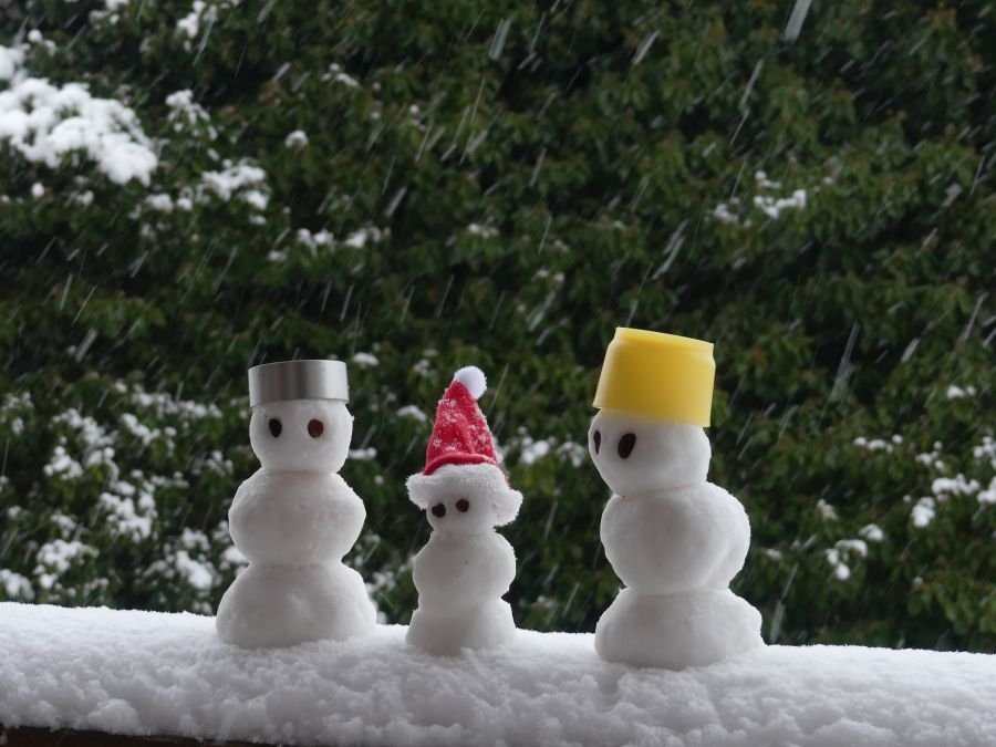 Bei uns hat es letztes Wochenende endlich geschneit. Meine Tochter hat auf unserem Balkon eine Miniaturfamilie gebaut.