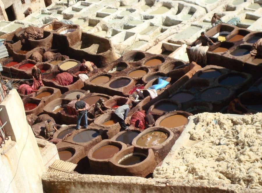 Eine Gerberei und Färberei in Marokko. Als Besucher bekommt man erstmal einen wohlriechenden Zweig Minze in die Hand, damit man es aushält