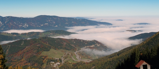 Re: Challenge 10/2012 • HerbstgoldAusblick vom Semmering, im Hintergrund am 2.Bild unter dem Nebel befindet sich Wien. Wien un Umgebung ist seit einer Woche total im Nebel, man kann kaum die Hand vor dem Gesicht sehen. Aber kaum kommt man zu den Voralpen ändert sich das Wetter schlagartig. Mußten wir unten bei 7°C frieren, konnten wir uns auf 1350m sonnen.