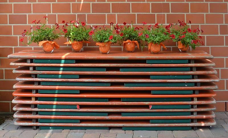 Das ist ein Schnappschuss zwischendurch, beim Aufräumen nach einer Party im Vorbeigehen entstanden. Mir gefällt der Kontrast zwischen den geraden Linien der zusammengeklappten Bierzeltgarnituren und den wuscheligen Formen der Tischdeko, die darauf abgestellt wurde.