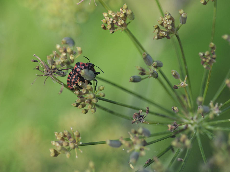 Re: Challenge 08/2015 • Born to be wildWanzen - sympathisch klingt das nicht. Dennoch sind darunter viele ansprechend gefärbte Tiere, und einen interessanten Lebenszyklus haben sie sowieso. Dankbare Fotomodelle unter den Insekten sind sie auch, weil nicht so hektisch wie z.B. Schmetterlinge. Heute Nachmittag fand sich eine Streifenwanze (Graphosoma lineatum) auf meinem Bronzefenchel ein: