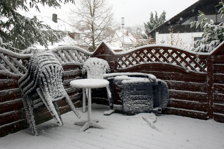 Re: Challenge 12/2016 • Schneeflöckchen, WeißröckchenWinter mit Schneeflöckchen und Weißröckchen kommt doch immer wieder überraschend. Wenn man dann zu faul war, rechtzeitig die Terrassenmöbel ins Winterquartier zu stellen, kann es so aussehen:
