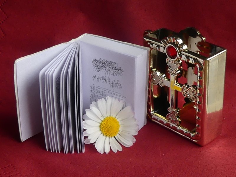 Re: Challenge 04/2021 • Stilles ÖrtchenZu Ostern habe ich diese winzig kleine, aber vollständige und sogar illustrierte Bibel mit goldenem Rahmen als Schlüsselanhänger aus Kolumbien geschenkt bekommen. Leider kann ich sie nicht lesen, und das liegt nicht (nur) an meinen unzureichenden Spanisch-Kenntnissen.