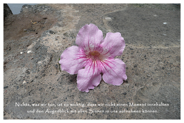 Re: Challenge 07/2012 • VergänglichkeitDiese Blüte lag vor mir auf der Straße, frisch vom Strauch gefallen. Mein Begleiter war schon weit voraus und ich dachte mir, die fotografierst du später auf dem Rückweg. Nach ein paar Metern wurde mir klar, dass es für diese Blüte in der heißen Sonne kein "später" geben wird und ich bin umgekehrt. Sie ist für mich ein Symbol der Vergänglichkeit und mahnt mich, Dinge, dir mir wichtig sind, nicht zu verschieben.
