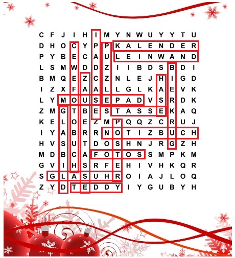 Habe ich doch glatt nicht die Frage bis zum Ende gelesen. Danke, so habe ich nun auch eine Chance: Es sind 16 Begriffe wie folgt: Kalender, Leinwand, Tasse, Notizbuch, Fotos, Glasuhr, Teddy, Glasbild, CEWE Fotobuch, Zaubertasse, IPAD Case, Puzzel, Poster; Hase und Bierkrug. Allen noch einen schönen 3. Advent. LG Bäuerin