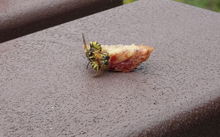 Re: Challenge 08/2017 • Da bewegt sich etwas ...Und nochmals Wespen: um ungestört unsere Brotzeit essen zu können, haben wir den beiden Wespen je ein kleines Stückchen an den Rand des Tisches getan, aber trotzdem, Kampf um den Leckerbissen.