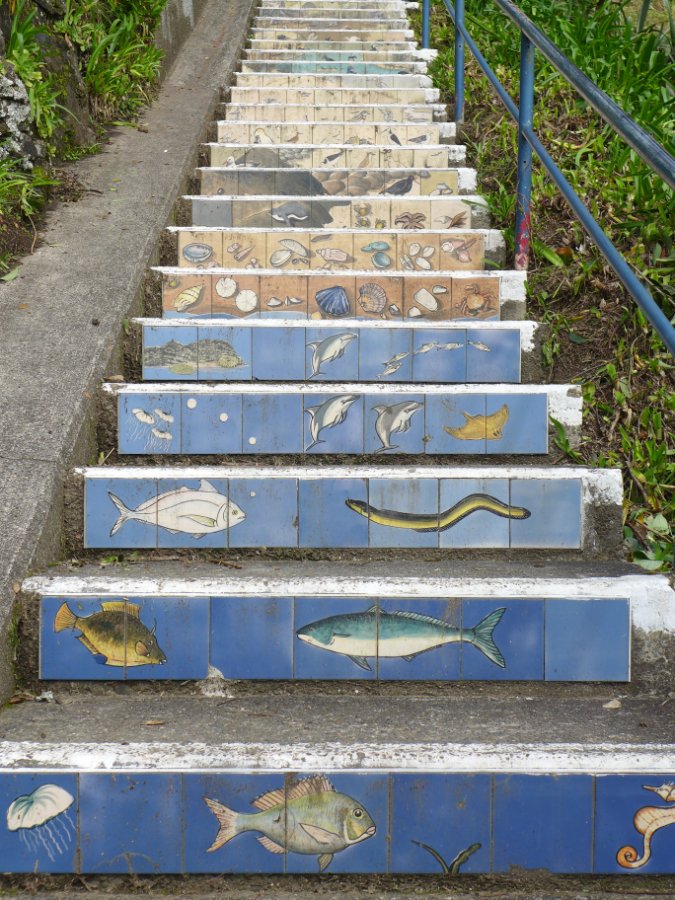 Re: Challenge 05/2021 • Hoch und höherAuf der Treppe, die die Flora und Fauna Neuseelands zeigt hinauf zu einem Aussichtspunkt (Whakatane, Nordinsel).
