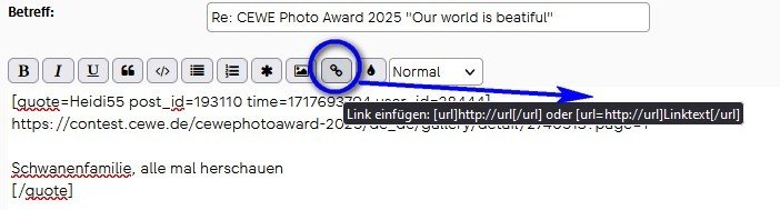 oder so: Schwanenfamilie, alle mal herschauenIn diesem Fall verbirgt sich der link hinter einem selbst gewählten Text. Hier die zugehörige Anleitung: Code:Alles auswählen Code:Alles auswählen Re: CEWE Photo Award 2025 "Our world is beautiful"Hallo @icke,