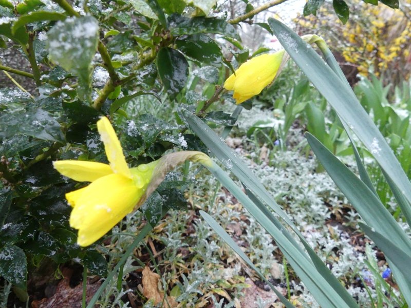 Kunigunde Re: Ei, Ei, Ei ein Ei dem anderen - 5. AprilMeine Osterglocken müssen den Schneeschauer aushalten - hoffentlich!