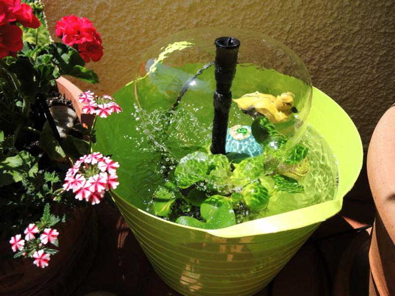 2) Weniger spektakulär aber sehr stimmungsvoll und beruhigend ist meine kleine Quelle im Bottich auf der Terasse.